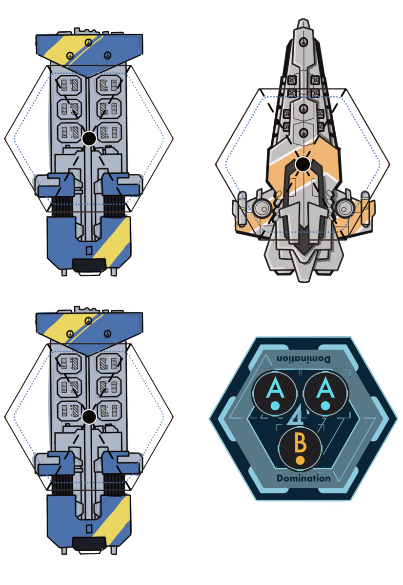 Arel-Zam’s cruiser (A) moves first. Opting for double speed, her starship races toward Caine’s frigate (B). She turns to bring her weapons to bear.